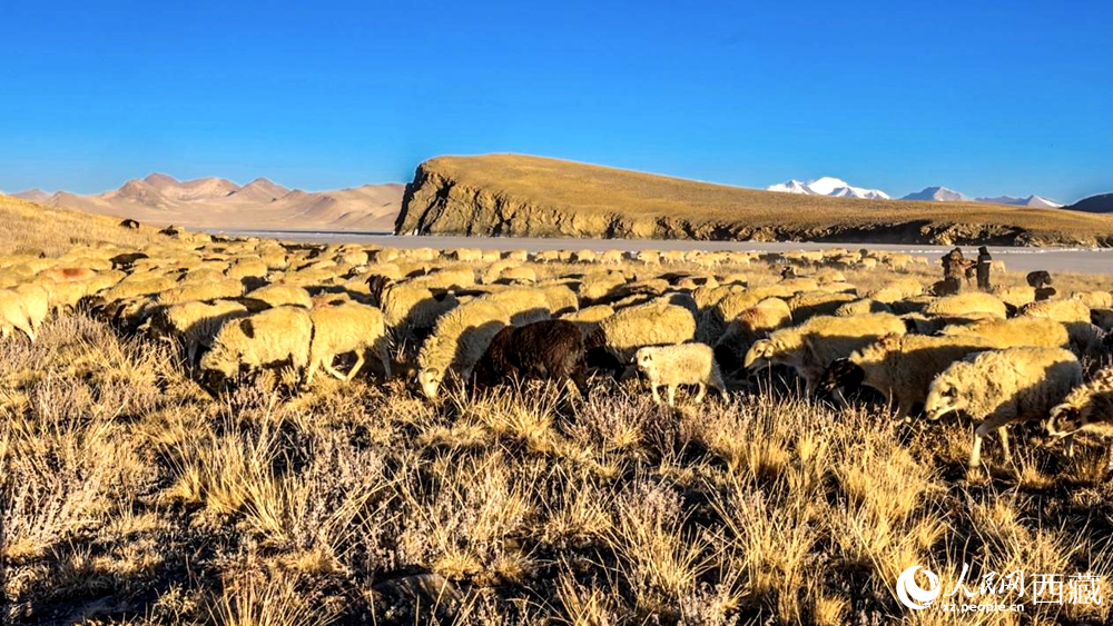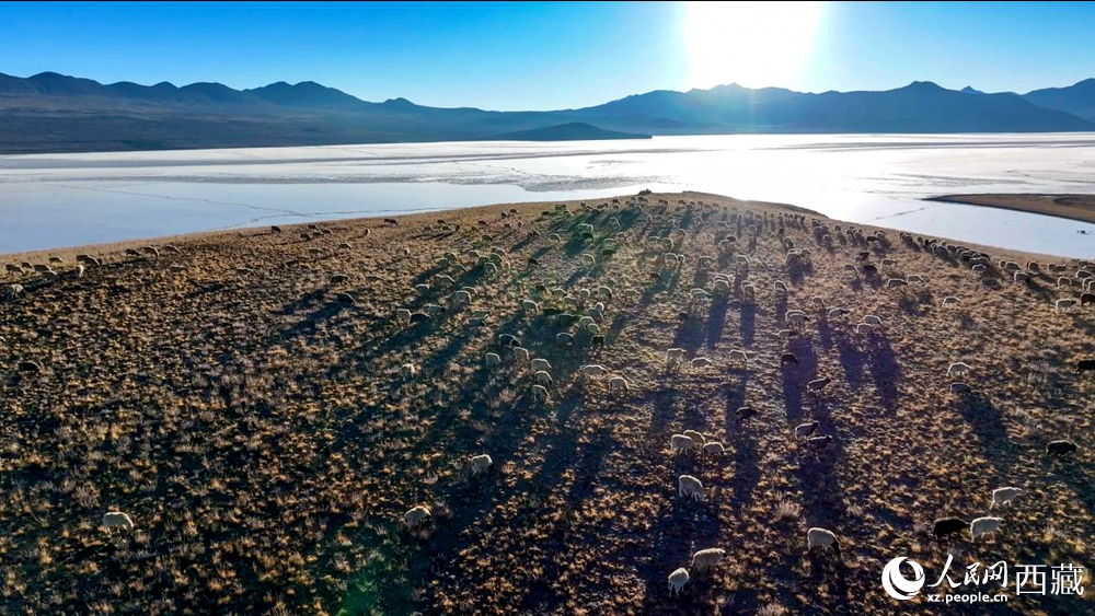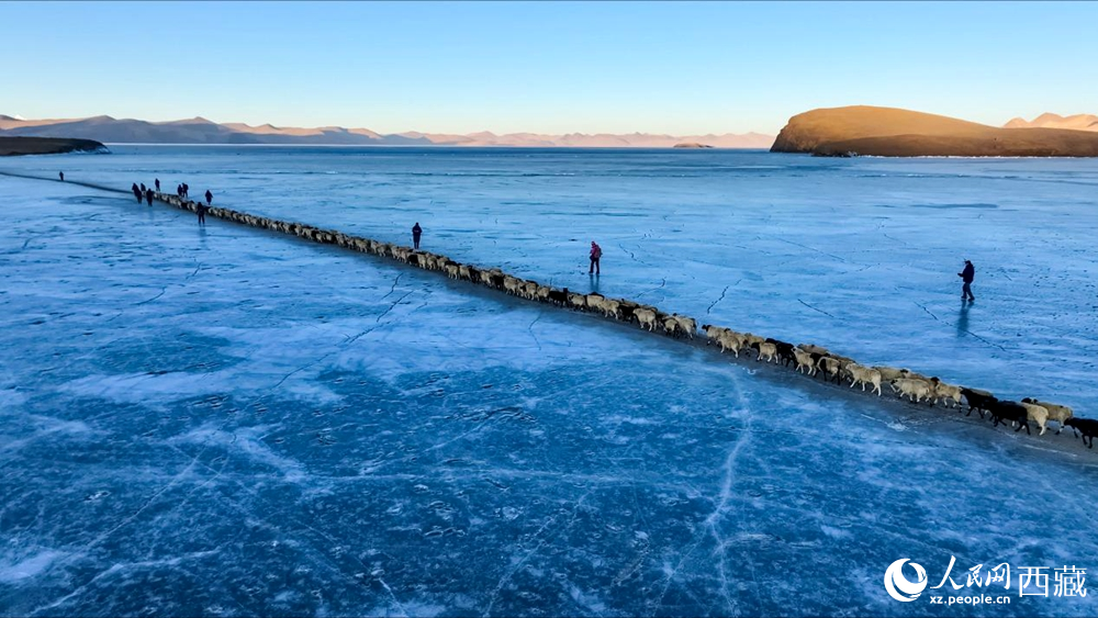 普莫雍錯(cuò)“冰上趕羊”,是當(dāng)?shù)啬撩袷来鄠鞯墓爬现腔?。每年冬季,由于推瓦村海拔高、夏季短,草?chǎng)無(wú)法為羊群提供充足的過(guò)冬飼料。因此,每年高原最冷的時(shí)候,推瓦村牧民會(huì)把羊群趕到普莫雍錯(cuò)水草豐茂的湖心島,依靠島上的草料度過(guò)最寒冷的冬期。