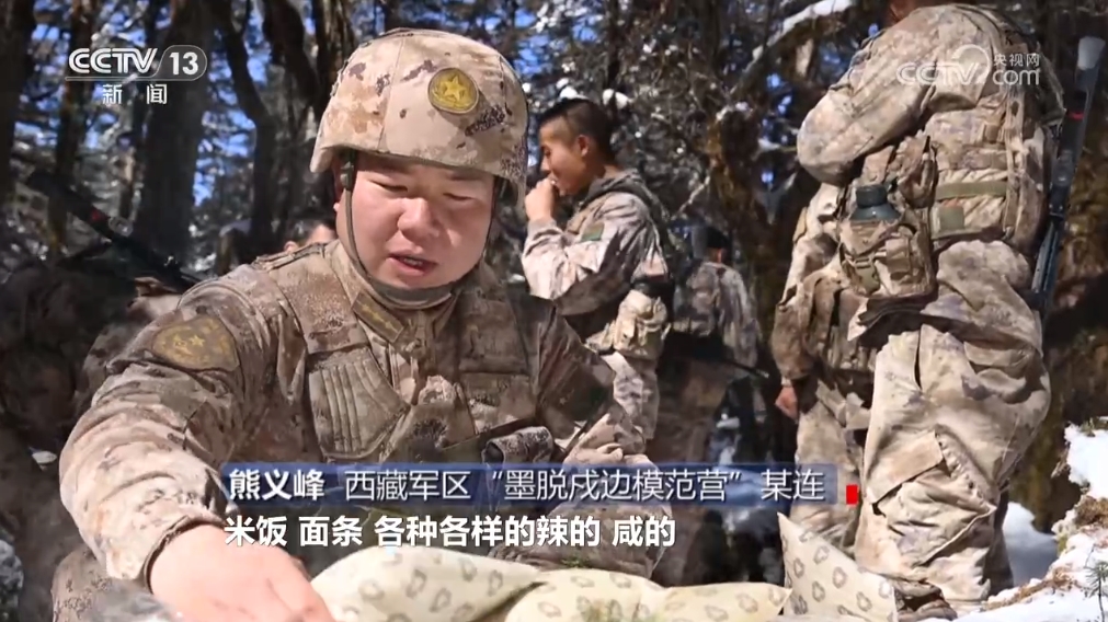 西藏軍區(qū)“墨脫戍邊模范營”某連熊義峰:“我們現(xiàn)在單兵自熱食品品種非常豐富,米飯、面條,各種各樣的,辣的、咸的,能夠滿足廣大官兵的口味需求。然后它的操作也非常簡單,就是加點水,操作非常便捷,熟得也很快,第三個,它這個熱量提供非常充足。因為我們在巡邏路上要經(jīng)常爬山,體力消耗很大,所以需要快速補充能量。”