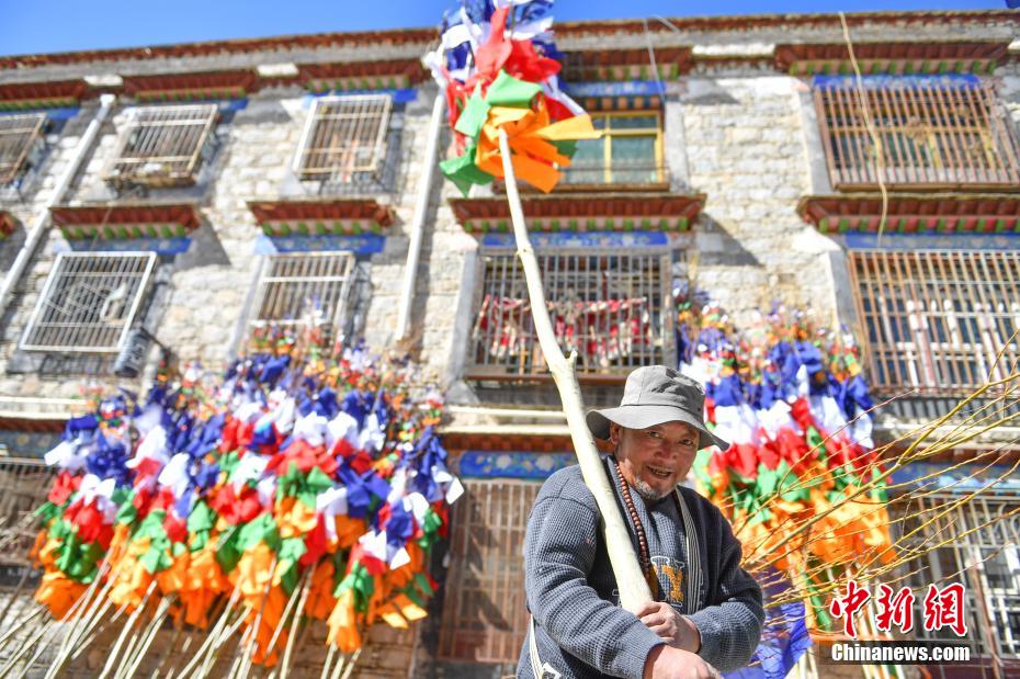 臨近藏歷新年,2月16日,在西藏拉薩街頭,農(nóng)牧民正縫制五彩經(jīng)幡樹(shù)。五彩經(jīng)幡樹(shù)是藏族民眾在藏歷新年前必備的年貨之一。藏歷新年期間,藏族民眾會(huì)選擇一個(gè)良辰吉日,為自家的房頂更換五彩經(jīng)幡樹(shù),祈求新的一年里五谷豐登,吉祥如意。圖為2月16日,頓珠扛著五彩經(jīng)幡樹(shù)。貢確 攝