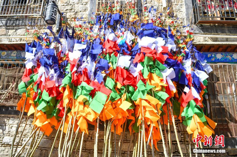 臨近藏歷新年,2月16日,在西藏拉薩街頭,農(nóng)牧民正縫制五彩經(jīng)幡樹(shù)。五彩經(jīng)幡樹(shù)是藏族民眾在藏歷新年前必備的年貨之一。藏歷新年期間,藏族民眾會(huì)選擇一個(gè)良辰吉日,為自家的房頂更換五彩經(jīng)幡樹(shù),祈求新的一年里五谷豐登,吉祥如意。圖為2月16日,制作完成的五彩經(jīng)幡樹(shù)。貢確 攝