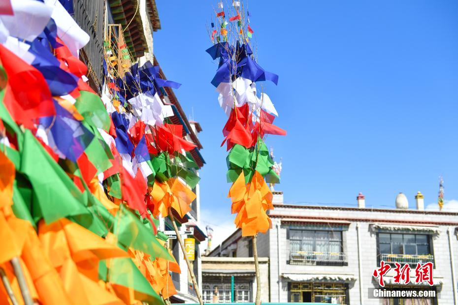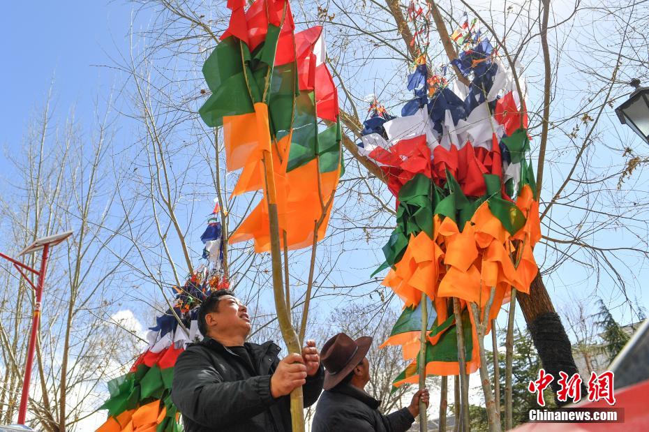 臨近藏歷新年,2月16日,在西藏拉薩街頭,農(nóng)牧民正縫制五彩經(jīng)幡樹(shù)。五彩經(jīng)幡樹(shù)是藏族民眾在藏歷新年前必備的年貨之一。藏歷新年期間,藏族民眾會(huì)選擇一個(gè)良辰吉日,為自家的房頂更換五彩經(jīng)幡樹(shù),祈求新的一年里五谷豐登,吉祥如意。圖為2月16日,拉薩市民正在挑選購(gòu)買(mǎi)五彩經(jīng)幡樹(shù)。貢確 攝