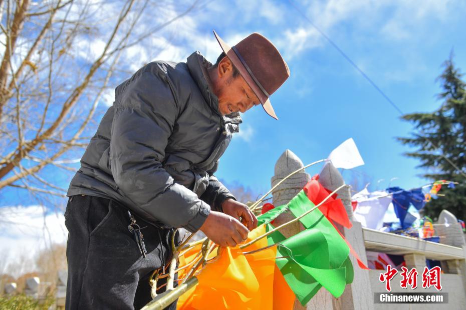 臨近藏歷新年,2月16日,在西藏拉薩街頭,農(nóng)牧民正縫制五彩經(jīng)幡樹(shù)。五彩經(jīng)幡樹(shù)是藏族民眾在藏歷新年前必備的年貨之一。藏歷新年期間,藏族民眾會(huì)選擇一個(gè)良辰吉日,為自家的房頂更換五彩經(jīng)幡樹(shù),祈求新的一年里五谷豐登,吉祥如意。圖為2月16日,頓珠正在縫制五彩經(jīng)幡樹(shù)。貢確 攝
