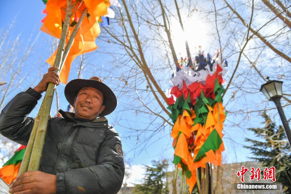 臨近藏歷新年,2月16日,在西藏拉薩街頭,農(nóng)牧民正縫制五彩經(jīng)幡樹(shù)。五彩經(jīng)幡樹(shù)是藏族民眾在藏歷新年前必備的年貨之一。藏歷新年期間,藏族民眾會(huì)選擇一個(gè)良辰吉日,為自家的房頂更換五彩經(jīng)幡樹(shù),祈求新的一年里五谷豐登,吉祥如意。圖為2月16日,來(lái)自尼木縣的普瓊扛著五彩經(jīng)幡樹(shù)。貢確 攝