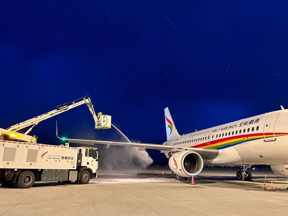 2月19日,停在拉薩貢嘎國(guó)際機(jī)場(chǎng)的TV9701航班。(民航西藏自治區(qū)管理局供圖)