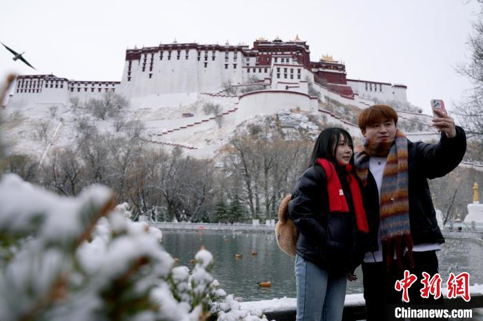 2月19日,西藏拉薩經(jīng)過持續(xù)降雪,城市四周白雪皚皚。雪山、建筑相映成景、風(fēng)光秀麗。圖為2月19日,游客在布達拉宮腳下的宗角祿康公園拍照留念。中新社記者 李林 攝