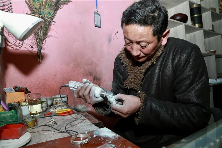 此時,一位顧客走進店內(nèi):“你好,我現(xiàn)在定做阿吉祖玉首飾大概什么時候能完成呀?”顧客滿懷期待地問道?!艾F(xiàn)在訂單比較多,不過您放心,在藏歷新年前肯定能完成?!贝窝攵嗉獰崆榈鼗貞?yīng)道。