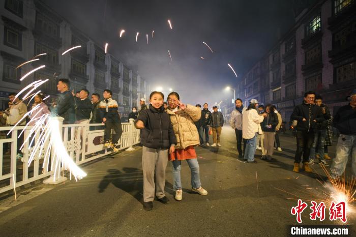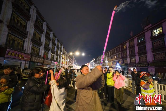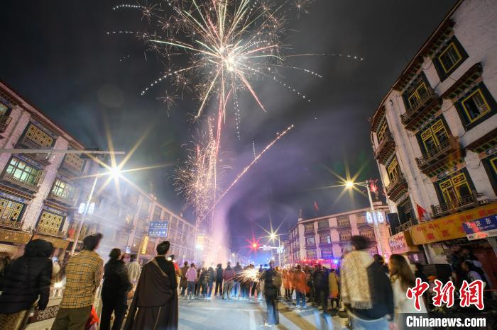 藏歷新年是西藏傳統(tǒng)民俗活動,也是中國國家級非物質(zhì)文化遺產(chǎn)。2月27日,西藏迎來一年一度的藏歷新年古突夜(類似春節(jié)的除夕),如今過古突夜,西藏民眾在點(diǎn)燃火把的同時(shí),也會燃放煙花,古城拉薩煙花璀璨。圖為2月27日晚,拉薩當(dāng)?shù)孛癖娕c游客等在街頭共同慶祝藏歷木蛇新年的到來。中新社記者 江飛波 攝