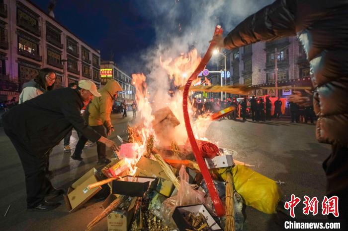 藏歷新年是西藏傳統(tǒng)民俗活動,也是中國國家級非物質(zhì)文化遺產(chǎn)。2月27日,西藏迎來一年一度的藏歷新年古突夜(類似春節(jié)的除夕),如今過古突夜,西藏民眾在點(diǎn)燃火把的同時(shí),也會燃放煙花,古城拉薩煙花璀璨。圖為2月27日晚,吃完古突(一種藏式面食)后,拉薩市民在街頭燃燒火把、燃放鞭炮等,迎接藏歷新年的到來。中新社記者 江飛波 攝
