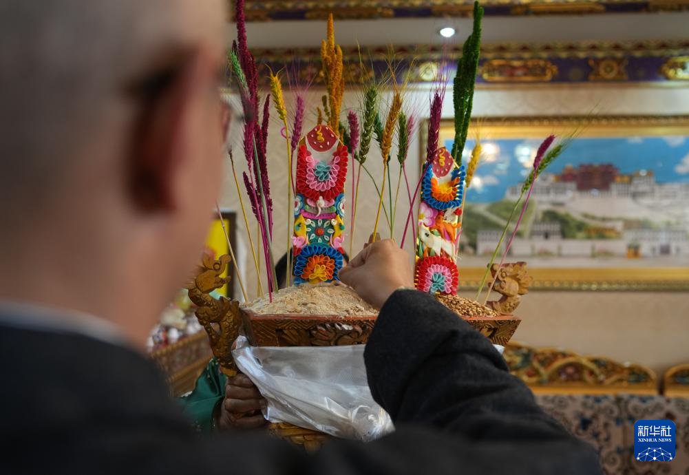 2月28日,身著藏裝的拉薩市民在吃寓意五谷豐登的“切瑪”。新華社記者 晉美多吉 攝