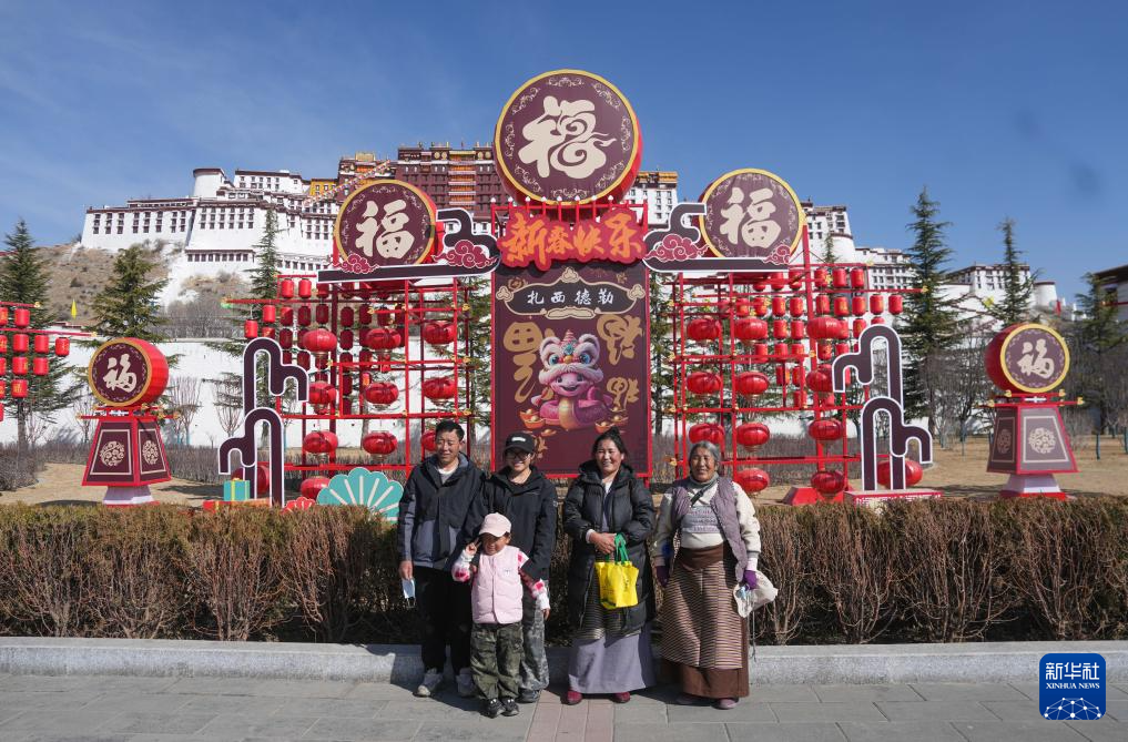 2月28日,來自西藏那曲市比如縣的一家人在拉薩布達拉宮前合影留念。新華社記者 晉美多吉 攝