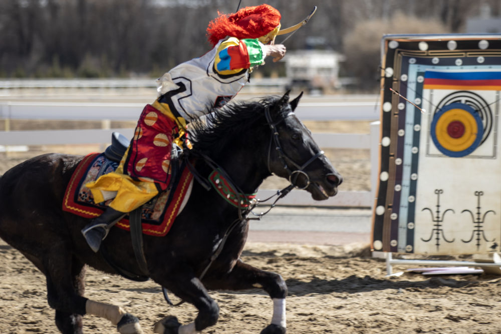 馬術(shù)隊員在表演“馬上民族傳統(tǒng)響箭五連靶”項目