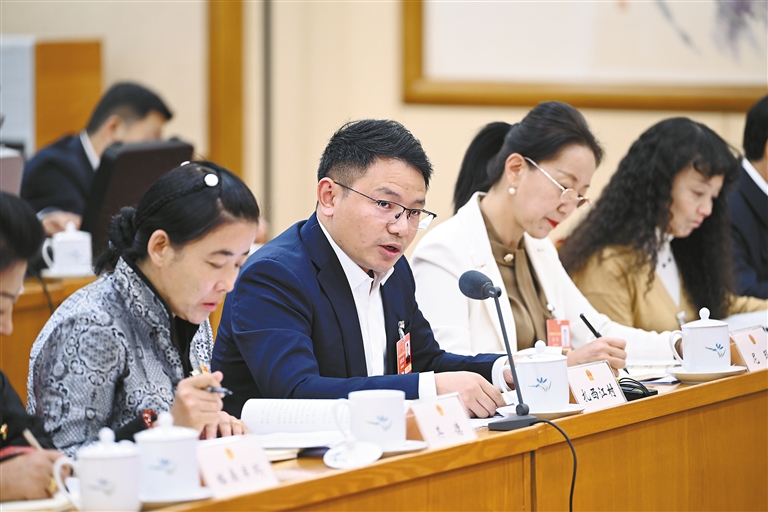 西藏全國人大代表扎西江村(中)在西藏代表團(tuán)全體會議上發(fā)言。