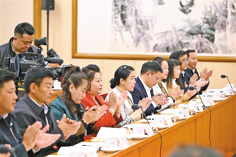 西藏全國人大代表在西藏代表團(tuán)全體會議上鼓掌通過各項(xiàng)決議草案。