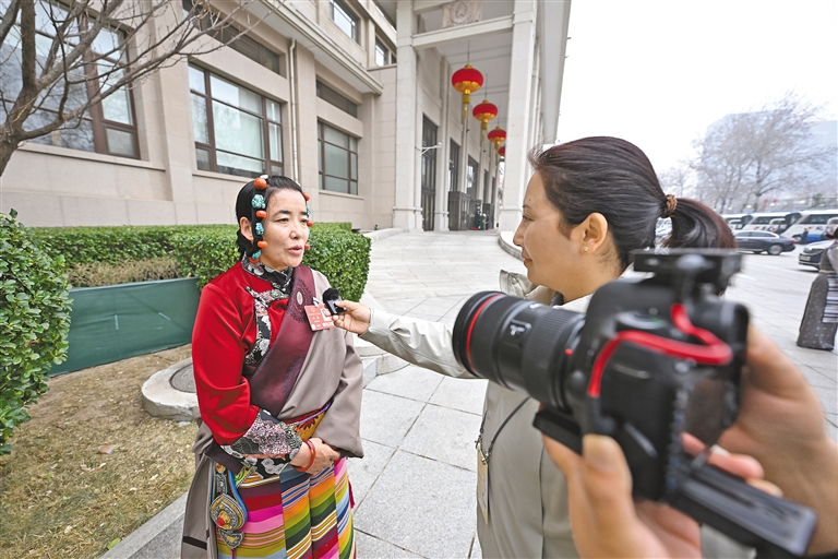 西藏全國人大代表其德(左)接受媒體采訪。