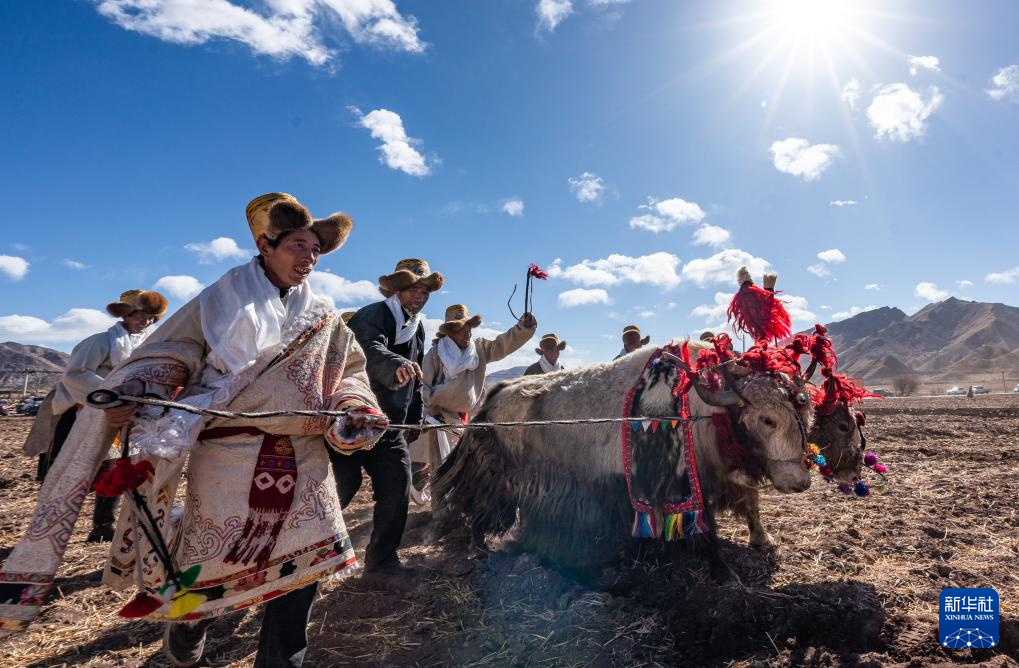 3月16日,在西藏拉薩市林周縣春堆鄉(xiāng)春耕典禮現場,農民沿襲傳統,使用“二牛抬杠”的方式翻土犁地。新華社記者 晉美多吉 攝