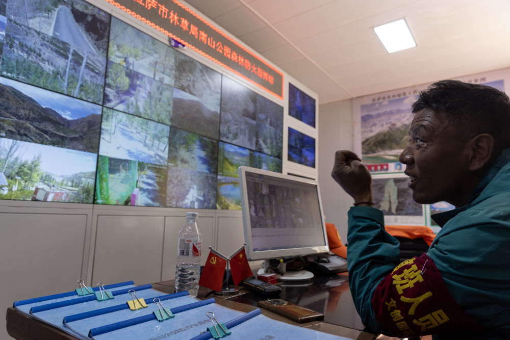 清晨,在拉薩南山公園,園區(qū)護林員扎西曲培早早來到監(jiān)控室,透過幾十個監(jiān)控畫面,注視著這片他守護了13年的山林——他不僅要監(jiān)控各處的植被情況,還要組織植樹、澆水、病蟲害防治等工作,確保樹木茁壯成長。