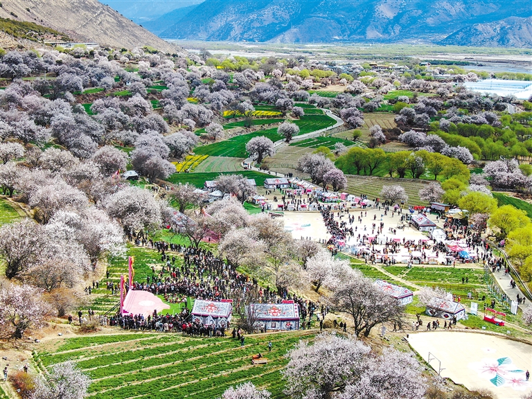 4月3日上午,林芝第二十二屆桃花旅游文化節(jié)巴宜區(qū)分會(huì)場(chǎng)活動(dòng)在布久鄉(xiāng)朵當(dāng)村桃花園舉行。圖為游客在朵當(dāng)村桃花園賞花游玩(無人機(jī)照片)。記者 劉楓 謝筱純 攝