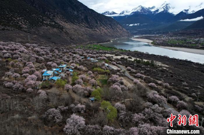 圖為4月4日,西藏林芝市雅魯藏布江沿線桃花風(fēng)光。(無人機(jī)照片)李林 攝