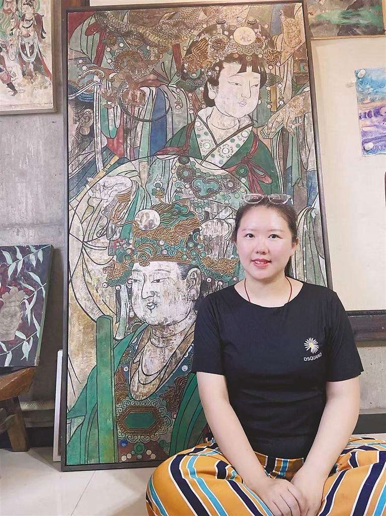 圖為劉曉彤展示她臨摹的壁畫作品。