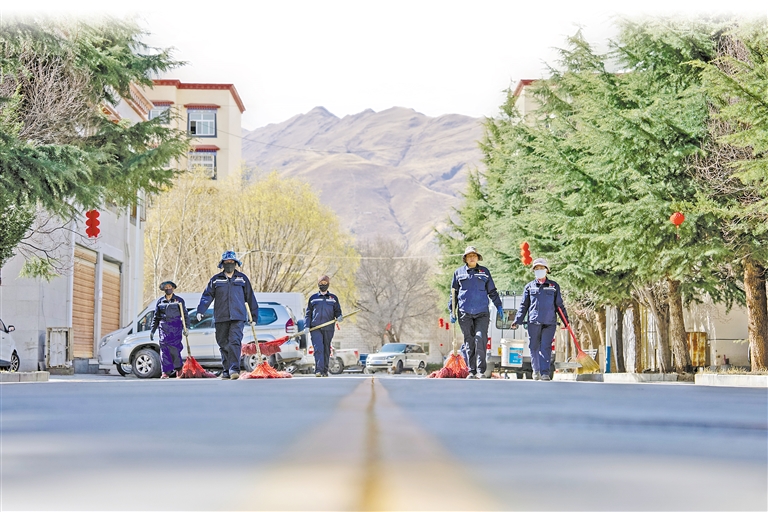物業(yè)服務部保潔團隊在清掃小區(qū)道路。記者 阿旺尼瑪 攝