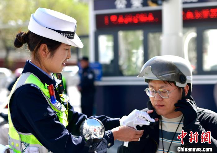 圖為拉薩市公安局交警支隊(duì)城北大隊(duì)副大隊(duì)長胡花芳為駕駛員調(diào)節(jié)頭盔。李林 攝