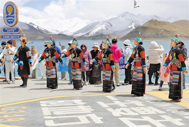 游客在羊卓雍錯景區(qū)欣賞特色民族歌舞表演。丹增平措 攝