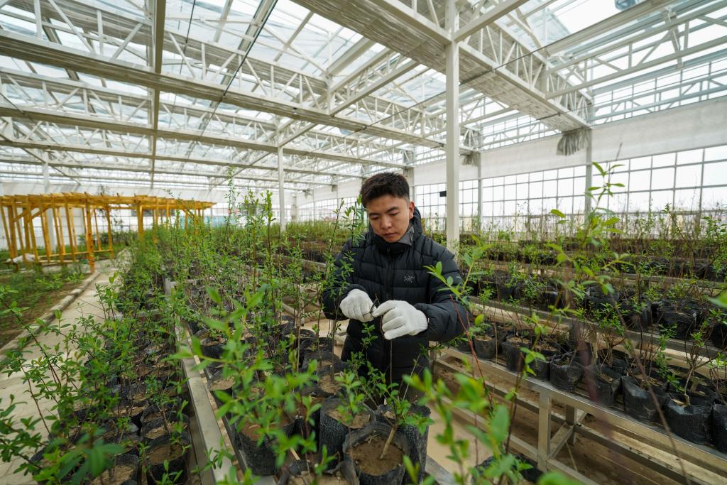2025年4月25日,那曲市林業(yè)和草原局工作人員在那曲高寒高海拔鄉(xiāng)土樹種培育基地給樹苗剪枝。新華社記者 晉美多吉 攝