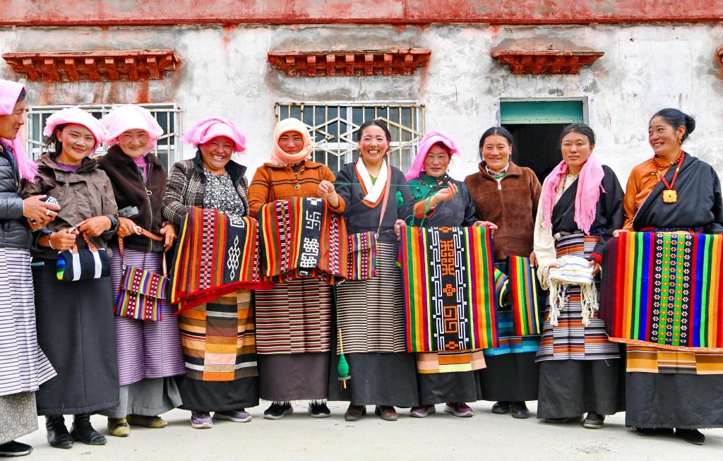 在海拔4000米以上的西藏那曲市色尼區(qū)木托村,婦委會主任措吉卓嘎(右五)和合作社成員展示部分編織產(chǎn)品。新華社記者 張汝鋒 攝