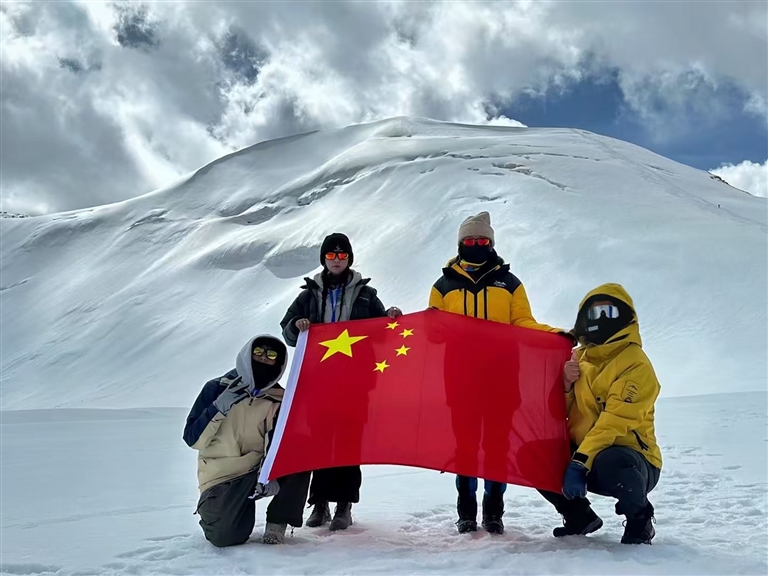 鄒師思告訴記者:“登山過程中,我們團隊展現(xiàn)了高度的專業(yè)性與協(xié)作力。學院領(lǐng)導提前提供物資與精神支持,專業(yè)教練指導徒步與技術(shù)訓練。在海拔5500—6000米段,隊伍統(tǒng)一行軍節(jié)奏,避免體溫流失或體力透支;登頂時,訓練突出者率先觸頂,為體力較弱者提供鼓勵與幫助。”她感慨:“團隊協(xié)作是登頂?shù)年P(guān)鍵,真正的勇氣源于科學準備與戰(zhàn)略堅持?!?/p>
