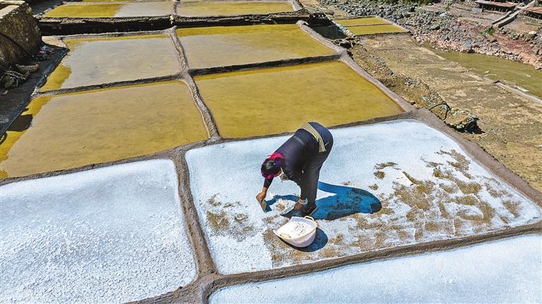 傳承千年的制鹽技術(shù),就是從鹽井汲取鹵水倒入貯鹵池存放5到6天,將貯鹵池中的鹵水灌注到鹽田中,依靠風(fēng)吹日曬析出鹽粒。而后,將結(jié)晶的鹽刮成弧形以充分脫水。每年的11月至次年6月為曬鹽季,其中3月到5月為旺季。收鹽的周期因氣候、地勢而異,平均3到5天收一次鹽。收鹽一般分兩道工序,第一道用薄木板或薄鐵片刮取最上層的鹽,這道鹽雜質(zhì)少,色澤干凈,為食用白鹽;第二道鹽因在刮取時(shí)會(huì)不可避免地混入泥土,無法食用,通常為養(yǎng)生紅鹽,也有部分會(huì)用于牲畜飼料制作。