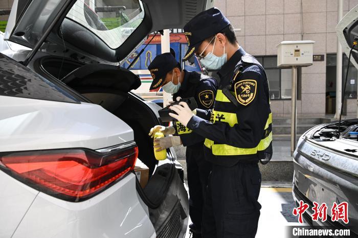 圖為西藏自治區(qū)日喀則市吉隆縣的吉隆口岸,海關(guān)工作人員在對(duì)出口的國產(chǎn)新能源汽車進(jìn)行檢查。貢嘎來松 攝