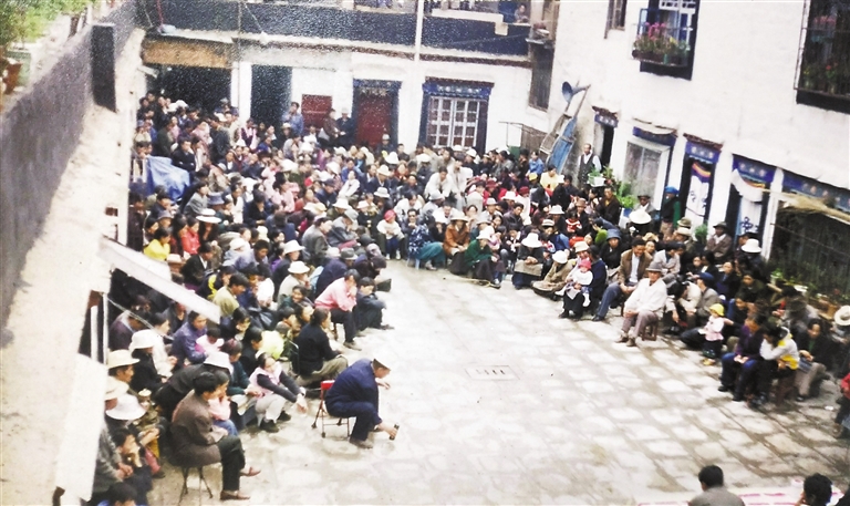 在當(dāng)時拍的另一張照片上,幾十位居民擠在過道里準(zhǔn)備投票?!澳菚r候院子小,選舉時得側(cè)著身子站。”德吉卓嘎回憶道,“院子窄小,雨天積水,但絲毫不影響大家參與社區(qū)事務(wù)的熱情?!闭掌囊唤牵?3歲的普布普赤正躲在母親身后好奇張望,如今她41歲,已成長為大院的戶長。