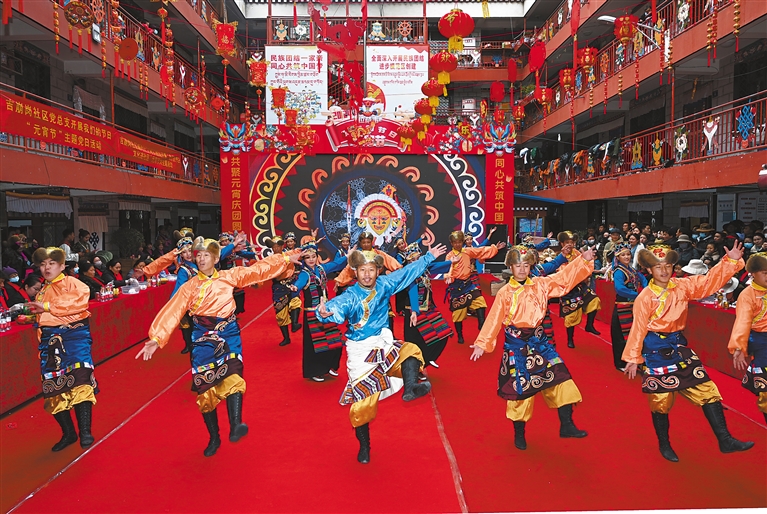 2025年2月23日,吉崩崗街道德賽大院開展慶元宵活動,雪巴拉姆藝術(shù)團(tuán)舞蹈演員正在表演節(jié)目。(資料圖片)