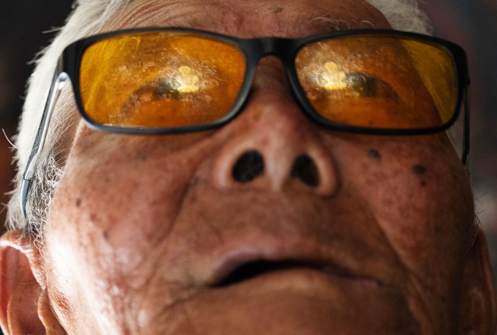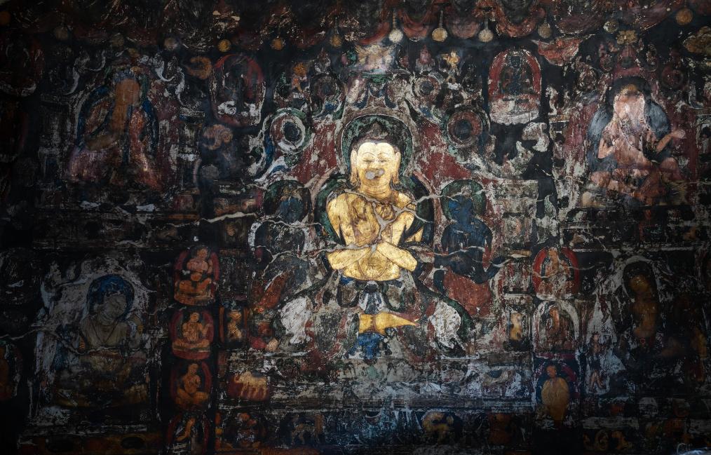 2023年5月26日,仁增旺扎在觀看石窟里的壁畫時(shí),一幅金色的佛像壁畫映在他的眼鏡上。