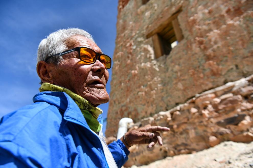今年77歲的仁增旺扎家住西藏阿里地區(qū)札達(dá)縣東嘎村皮央組。他的家與宏偉壯觀的皮央石窟僅咫尺之遙,民居依偎在高聳的石窟群之下,形成了強(qiáng)烈的視覺(jué)落差。皮央石窟群與兩公里外的東嘎扎西曲林寺遺址一起組成了西藏最大的佛教石窟遺址——皮央和東嘎石窟遺址。