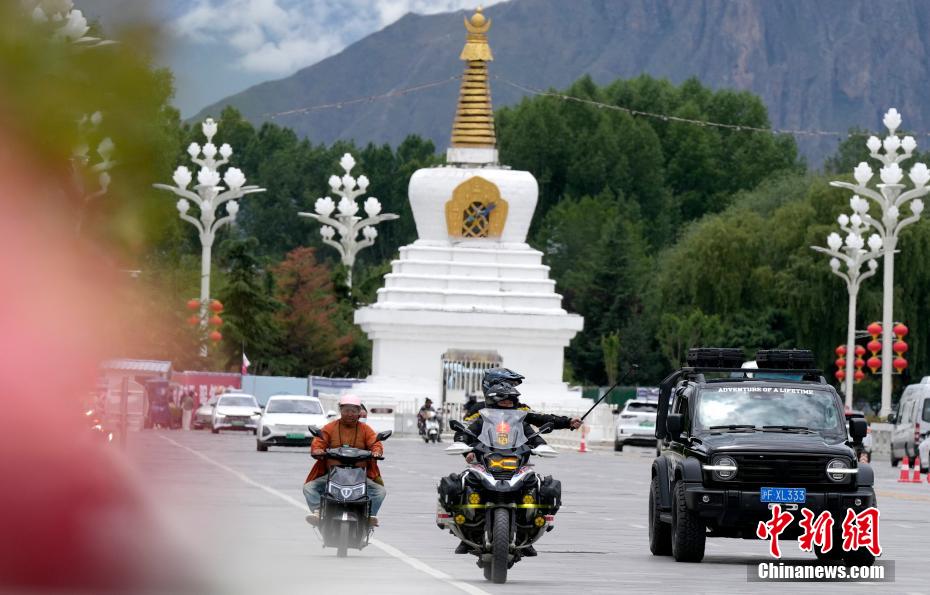 7月3日,摩旅愛好者行駛在拉薩街頭。隨著暑期旅游旺季的到來,進藏自駕游成為旅行愛好者的熱門選擇。房車愛好者、摩旅愛好者選擇自駕抵達拉薩,專程途經(jīng)布達拉宮打卡。中新社記者 李林 攝