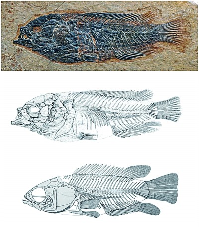 西藏始攀鱸化石(上),吳飛翔繪素描圖(中)及骨骼復(fù)原圖(下)