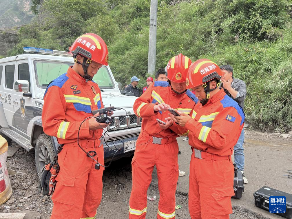 7月8日,西藏消防救援總隊救援人員在救災(zāi)現(xiàn)場搭建4G單兵圖傳系統(tǒng)。新華社發(fā)(徐達富攝)