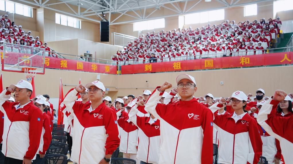 7月29日,2025年大學生志愿服務西部計劃服務西藏專項志愿者出征儀式上,志愿者們正在宣誓。陳梟 攝