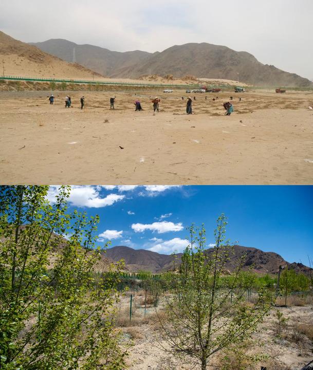 這是一張拼版照片。上圖為西藏山南市貢嘎縣境內(nèi)拍攝的“先造后補工程”(2021年攝);下圖為西藏山南市貢嘎縣境內(nèi)拍攝的拉薩南北山造林綠化(貢嘎段)(2025年4月24日攝)。新華網(wǎng) 旦增努布 攝