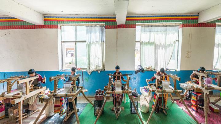 山南市貢嘎縣杰德秀鎮(zhèn)的格桑圍裙農(nóng)牧民專業(yè)合作社里,旦增卓嘎和合作社的婦女在編織“邦典”(2025年4月23日攝)。新華社記者 丁增尼達 攝