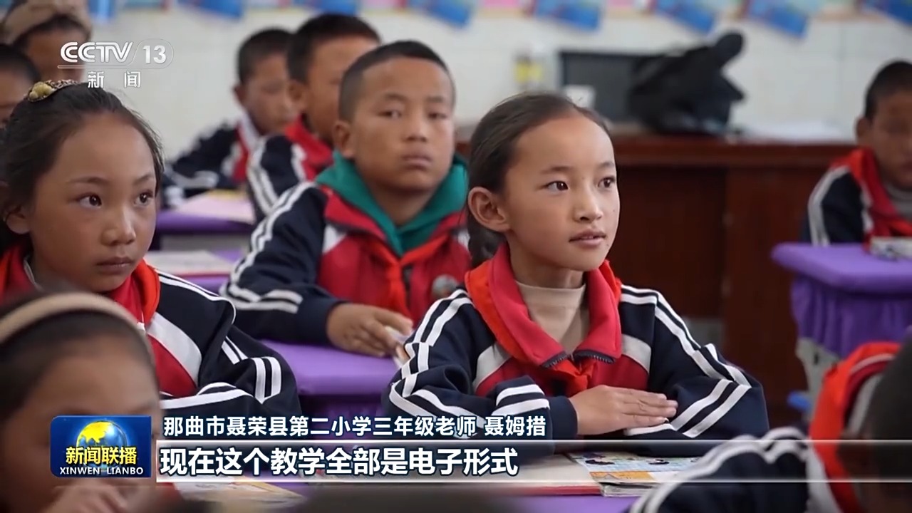 那曲市聶榮縣第二小學(xué)三年級(jí)老師 聶姆措:變化特別大,以前鄉(xiāng)鎮(zhèn)里面都是帳篷學(xué)校,黑板就是這么小的一個(gè)木板,冬天帳篷里面的話,手腳都是凍著的。現(xiàn)在這個(gè)教學(xué)全部是電子形式,條件特別好。