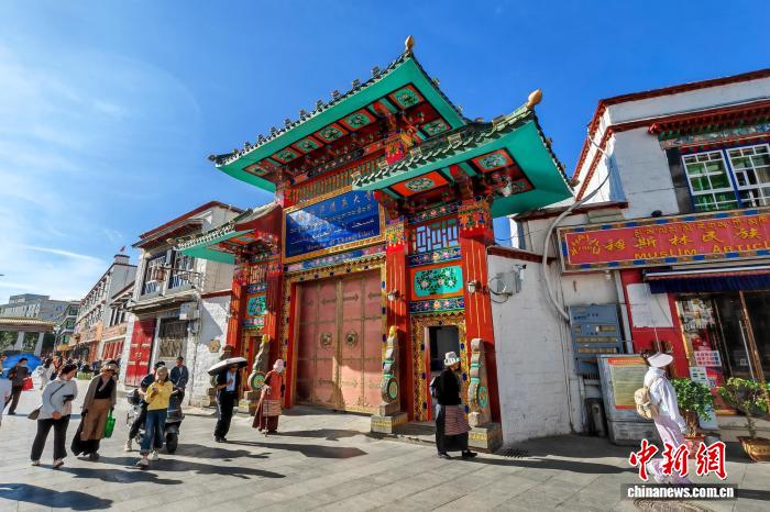 8月1日,藍天下,拉薩清真大寺的大門體現(xiàn)出斗拱結(jié)構(gòu)和藏式涂裝風(fēng)格的結(jié)合。中新社記者 江飛波 攝