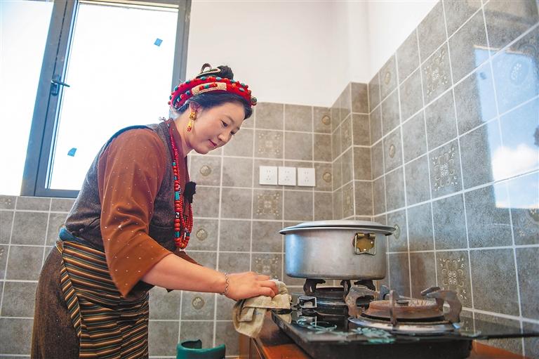 定結(jié)縣乃村村民在新房?jī)?nèi)收拾廚房。記者 旦增嘎瓦 攝