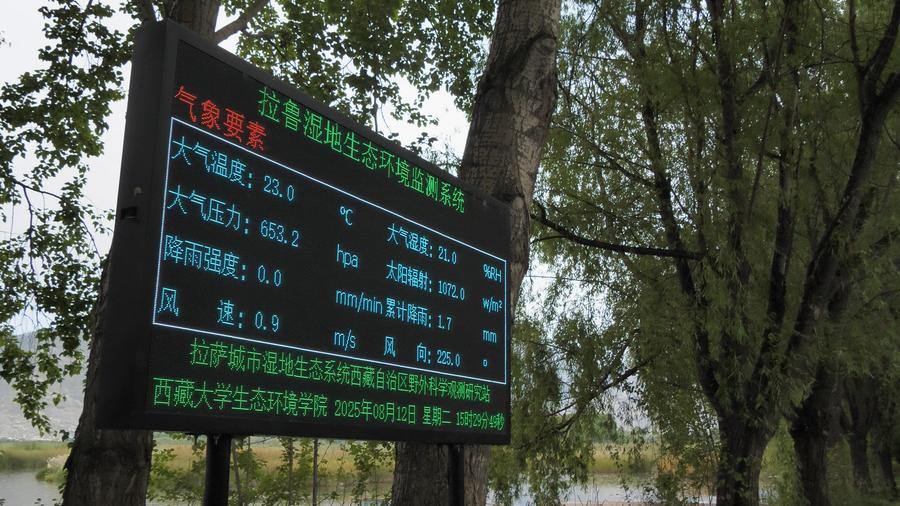拉魯濕地國(guó)家級(jí)自然保護(hù)區(qū)南門內(nèi)的生態(tài)環(huán)境監(jiān)測(cè)系統(tǒng)顯示屏,實(shí)時(shí)顯示濕地內(nèi)的氣象要素、土壤和水環(huán)境、植被指數(shù)等數(shù)據(jù)。新華社記者 黃智琪 攝