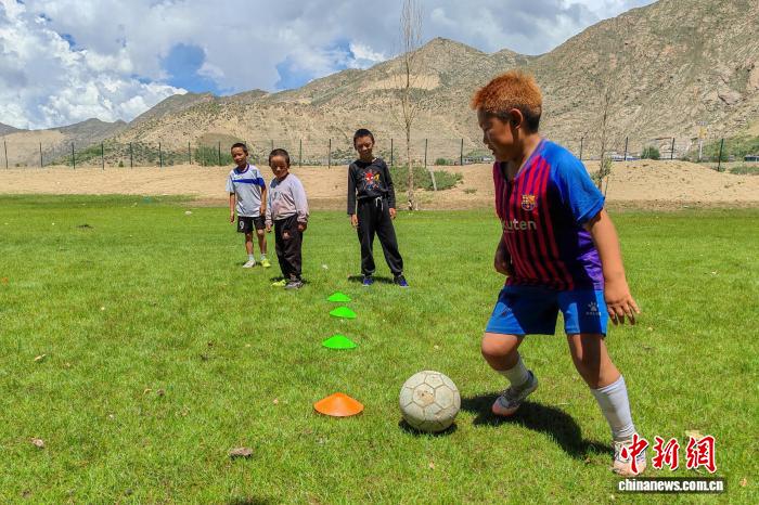 圖為8月12日,一群雙湖搬遷而來的兒童在森布日安置點一處草地上練習足球。江飛波 攝