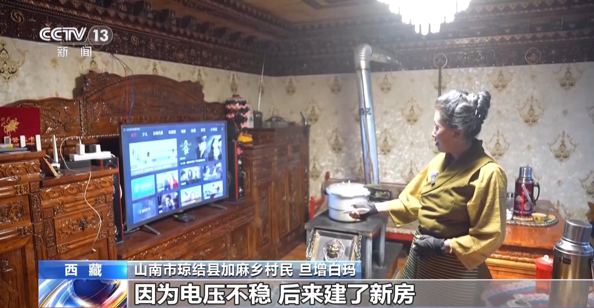 山南市瓊結(jié)縣加麻鄉(xiāng)村民 旦增白瑪:這個(gè)是2023年新建的,這邊是以前住的地方,只有一個(gè)燈泡,其他家電也不敢用,因?yàn)殡妷翰环€(wěn)。后來(lái)建了新房,現(xiàn)在電壓穩(wěn)了,可以放心看電視,而且還買了很多新家電,冰箱、洗衣機(jī)、電視。