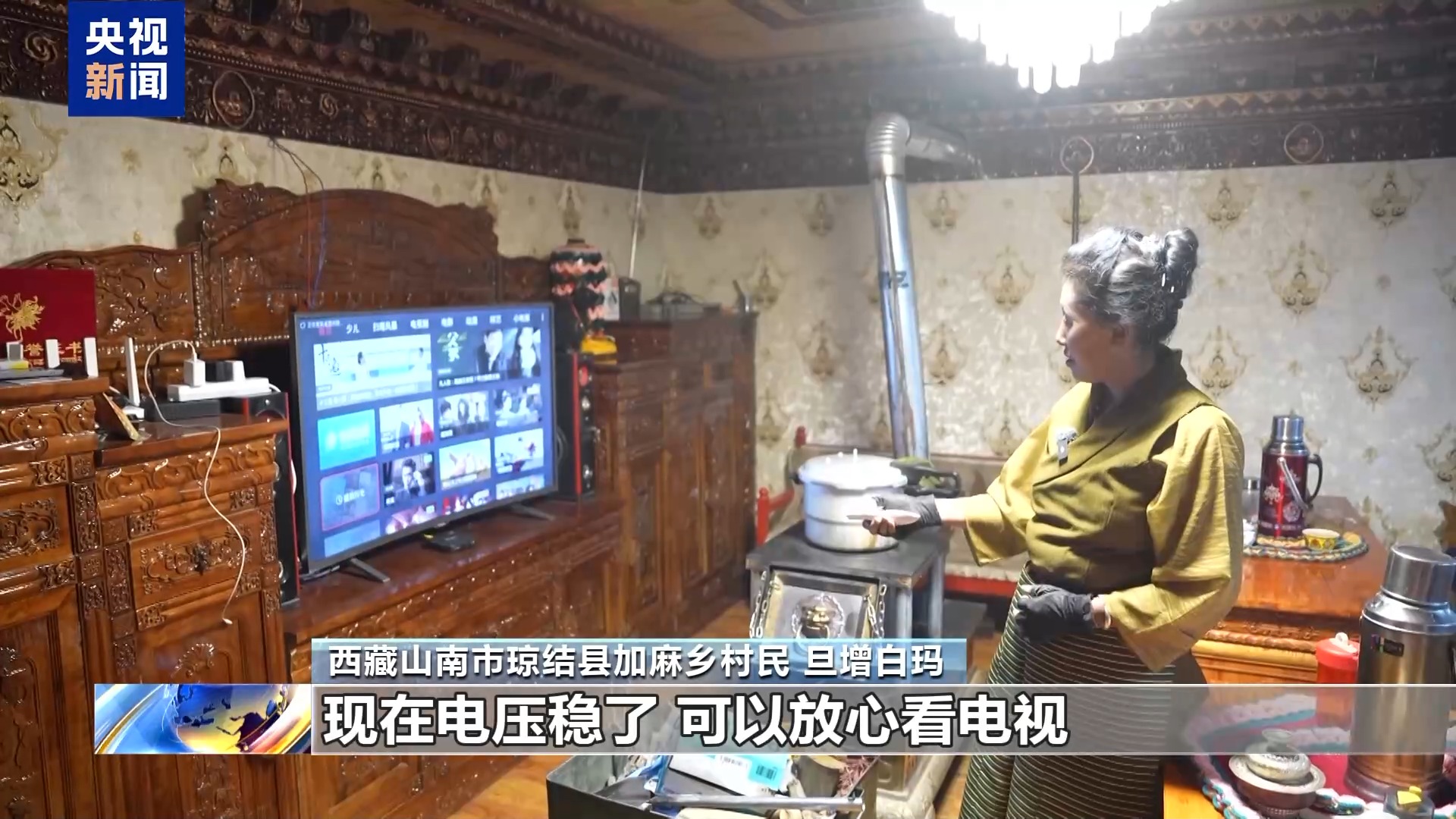 西藏山南瓊結縣加麻鄉(xiāng)村民 旦增白瑪:現(xiàn)在電壓穩(wěn)了,可以放心看電視。而且還買了很多新家電,冰箱、洗衣機。