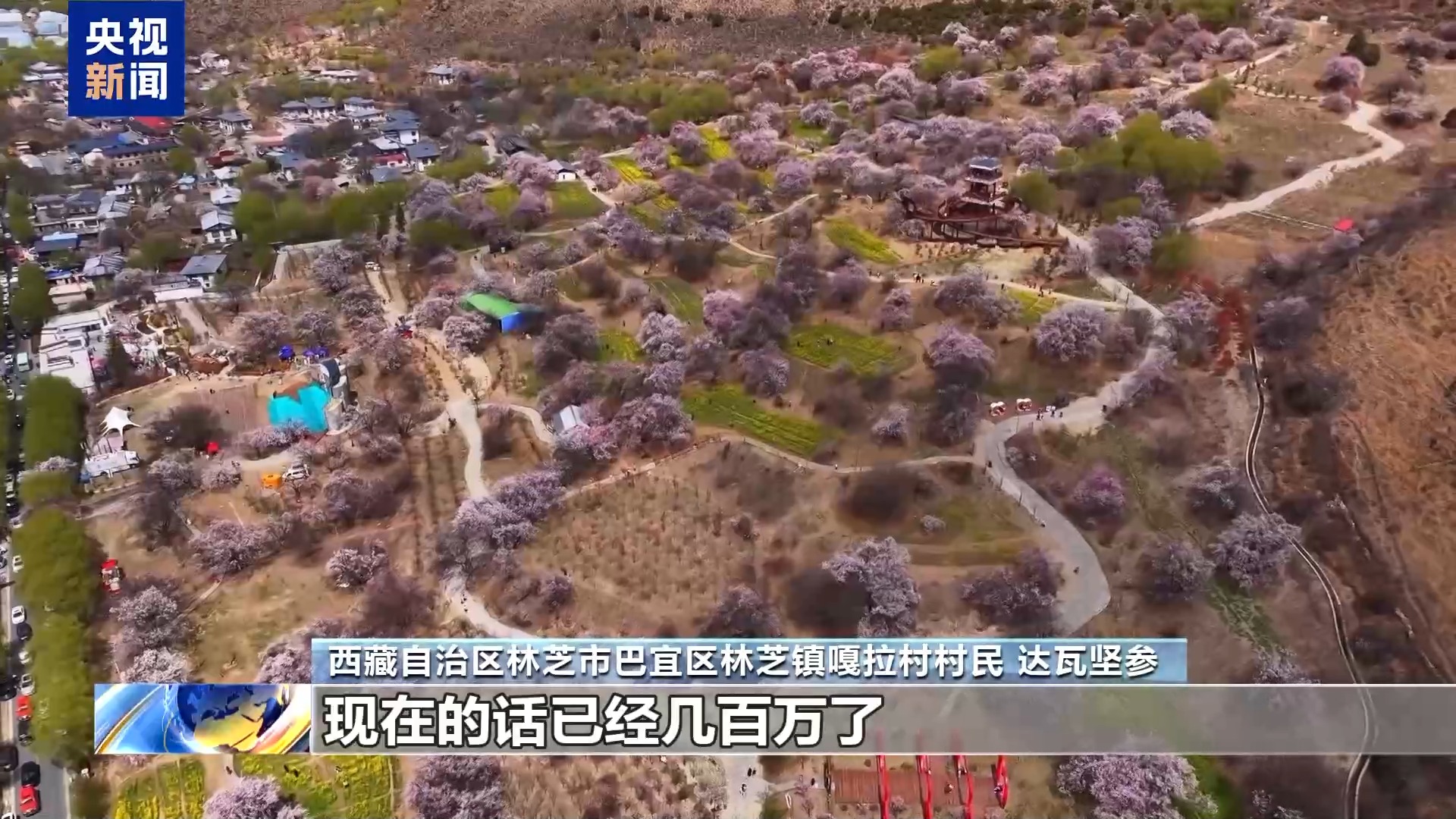 西藏自治區(qū)林芝市巴宜區(qū)林芝鎮(zhèn)嘎拉村村民 達瓦堅參:以前從桃花節(jié)開始搞起來的時候,全村收入幾百塊錢到幾千塊錢到幾萬塊錢,現(xiàn)在的話已經幾百萬了。