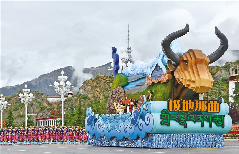 在慶祝大會群眾游行環(huán)節(jié),9輛主題彩車成為最耀眼的明星,與26個群眾方隊一起,組成“旗幟引領”“四件大事”“奮進新時代”“走向未來”四大篇章,在歡快鼓點中徐徐前行,鋪展出一幅流動的新時代雪域長卷。打頭的“旗幟引領”彩車,車頭高擎巨型黨旗,八面五星紅旗緊隨其后,昭示各族兒女永遠心向黨中央。收尾的“走向未來”彩車,車身以數(shù)字“60”為主體,華表、紅飄帶、中國結(jié)環(huán)列四周,宣示建設團結(jié)富裕文明和諧美麗的社會主義現(xiàn)代化新西藏的堅定決心。首尾呼應的紅色,將整場游行化作一曲感恩奮進的贊歌。